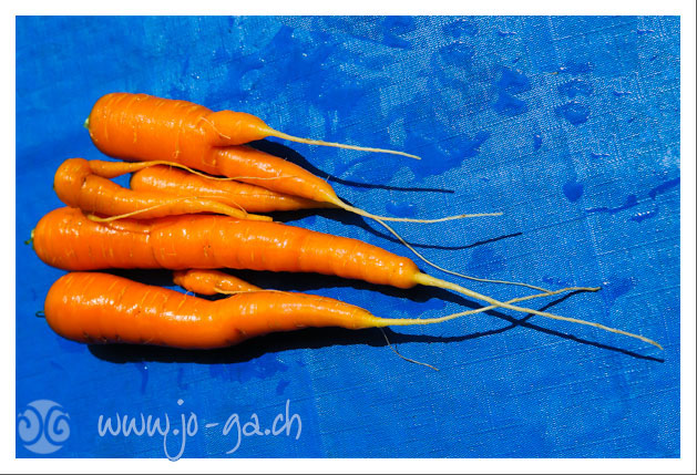 Karotten direkt aus Zia Lorettas Garten… so saftig und knackig wie sie auf diesem blauen Tischtuch aussehen so sind sie auch… Wohl die beste Zwischenverpflegung um in den Bergen zu spazieren.. (wandern kann man das ja nicht wirklich nennen was wir da machen… 😉 )